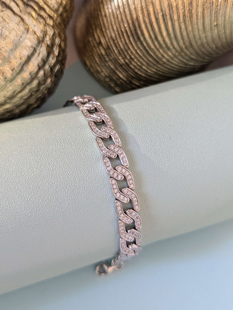 This stunning platinum Cuban link bracelet is adorned with brilliant moissanite stones, each link sparkles beautifully, catching the light and adding a touch of sophistication to any outfit.